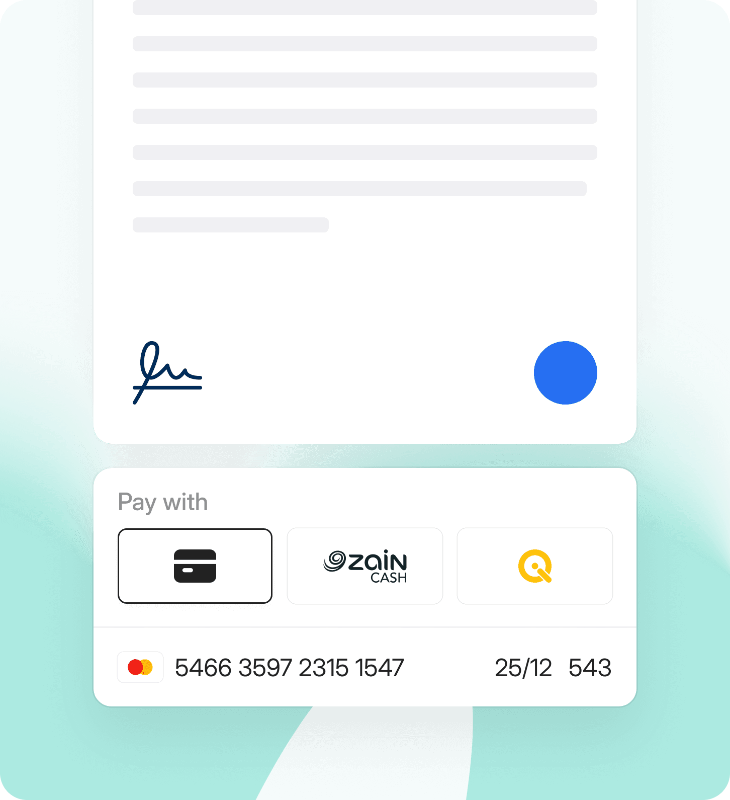 بوابة دفع الكتروني توفر تجربة دفع متماسكة وسلسلة مدمجة داخل تطبيقك او موقعك من خلال واجهة برمجة تطبيقات مبسطة. دع زبونك يختر وسيلة وسيلة الدفع المفضلة لديه يحفظ معلوماتة وبطاقاته ويتابع مدفوعاته.